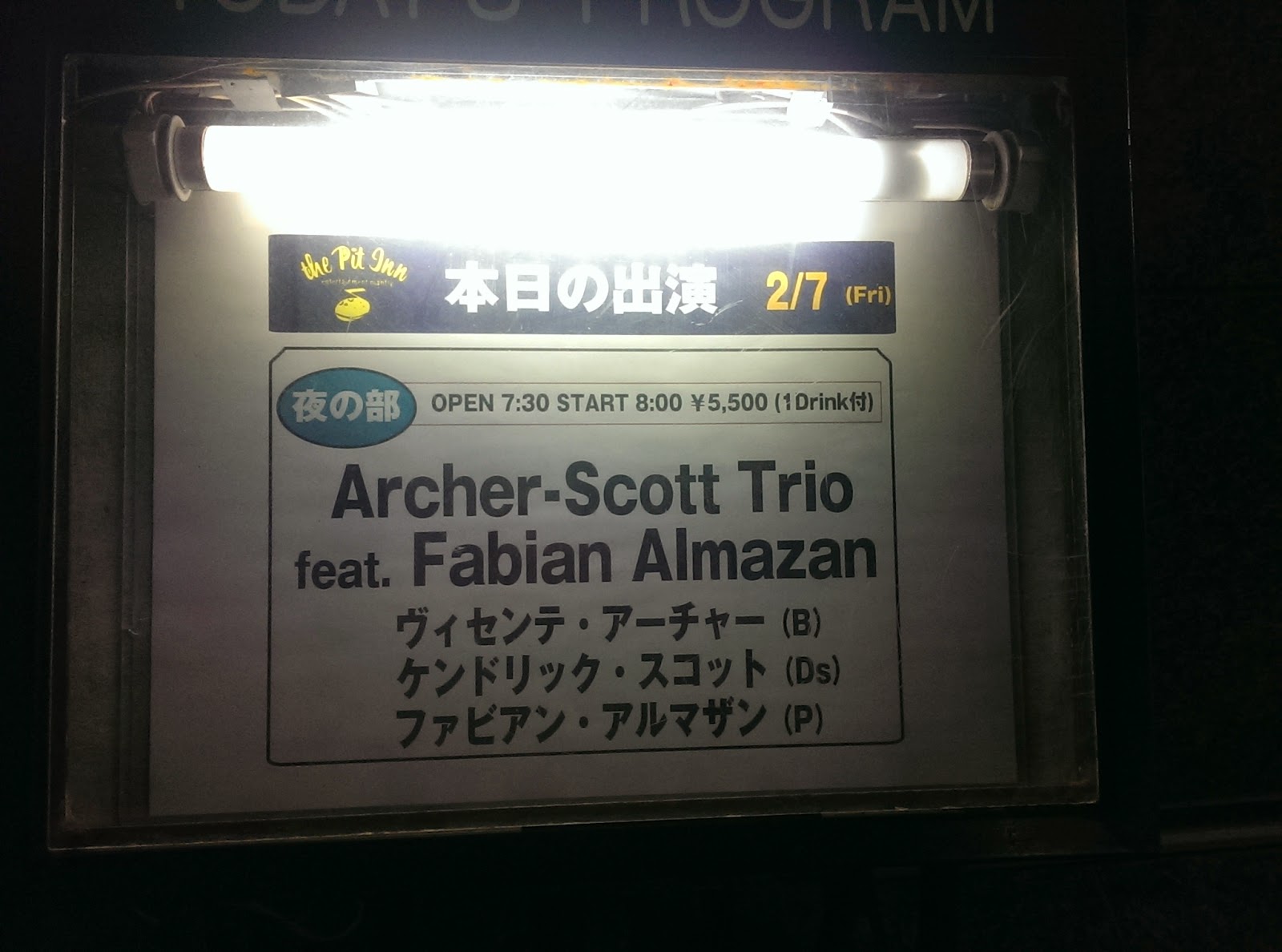 Archer-Scott Trioは、前半ピアニストFabian Almazanの静かなオリジナル曲が目白押しでしたが客がみんな眠そうだったので後半はばりばりのバップにシフト。2nd SetはKeith Jarrettの"Bop-Be"ではじめアンコールは循環の"The Theme"(たしか)で締めるというスタンダードを絡めたジャズマンらしい機転の効いたラインナップ。